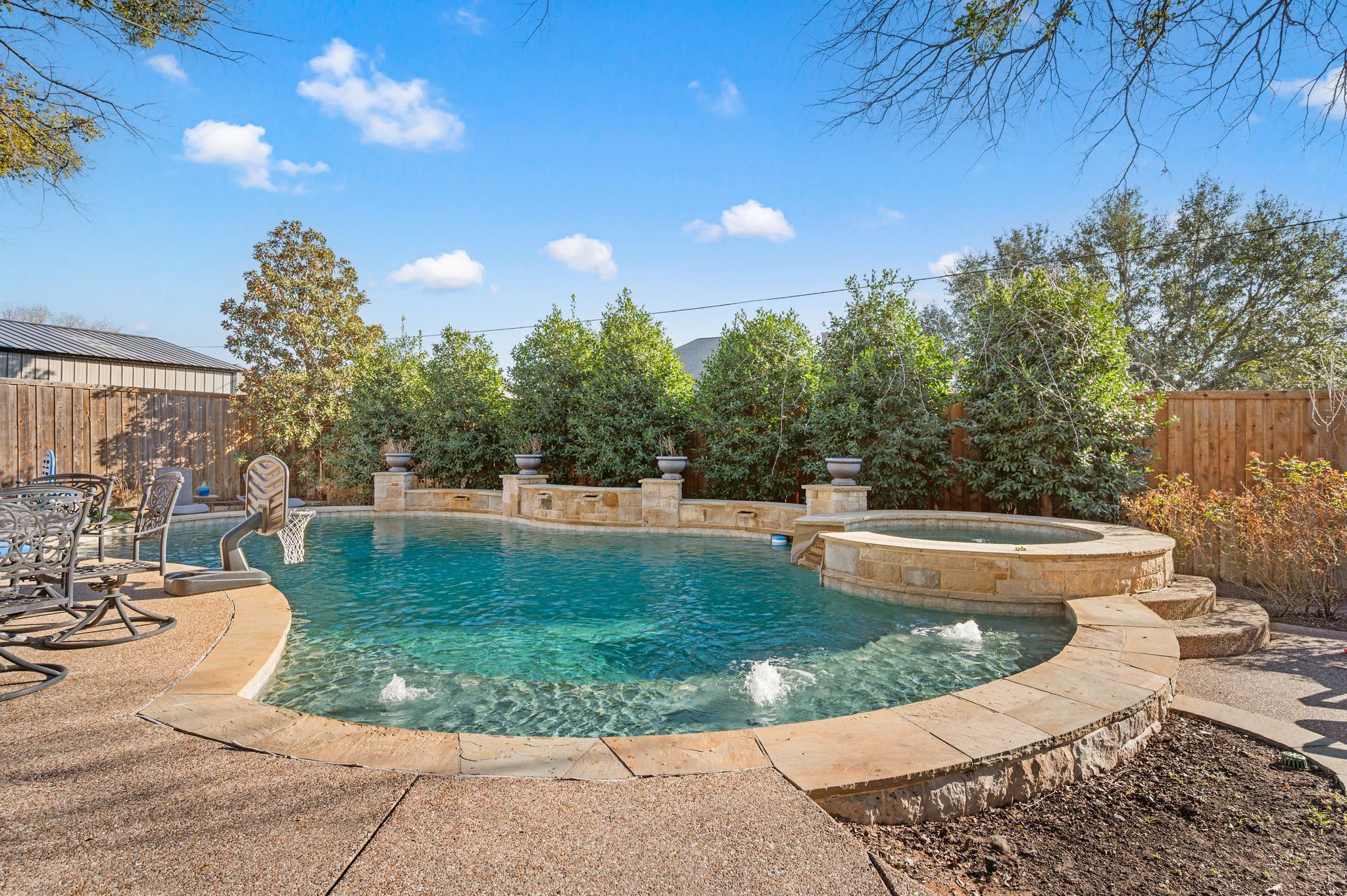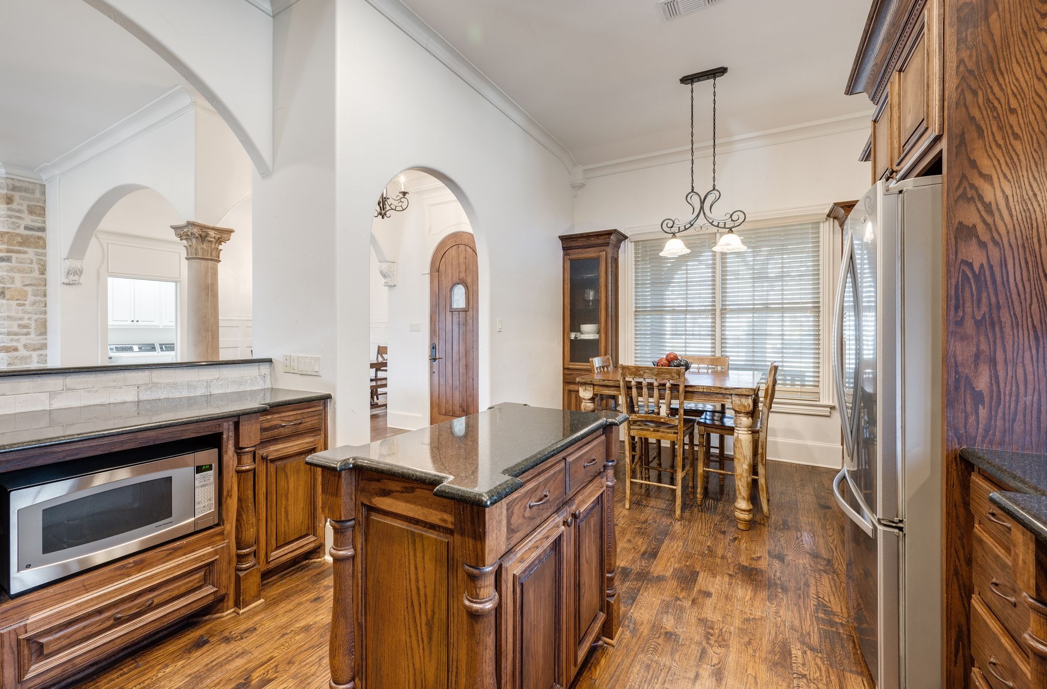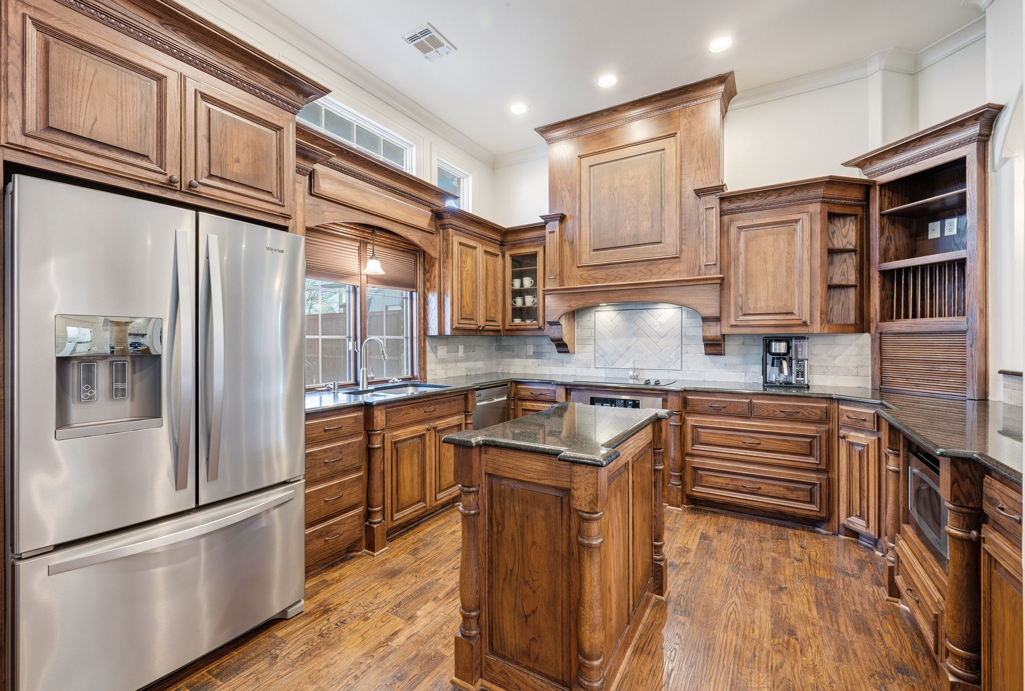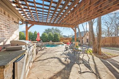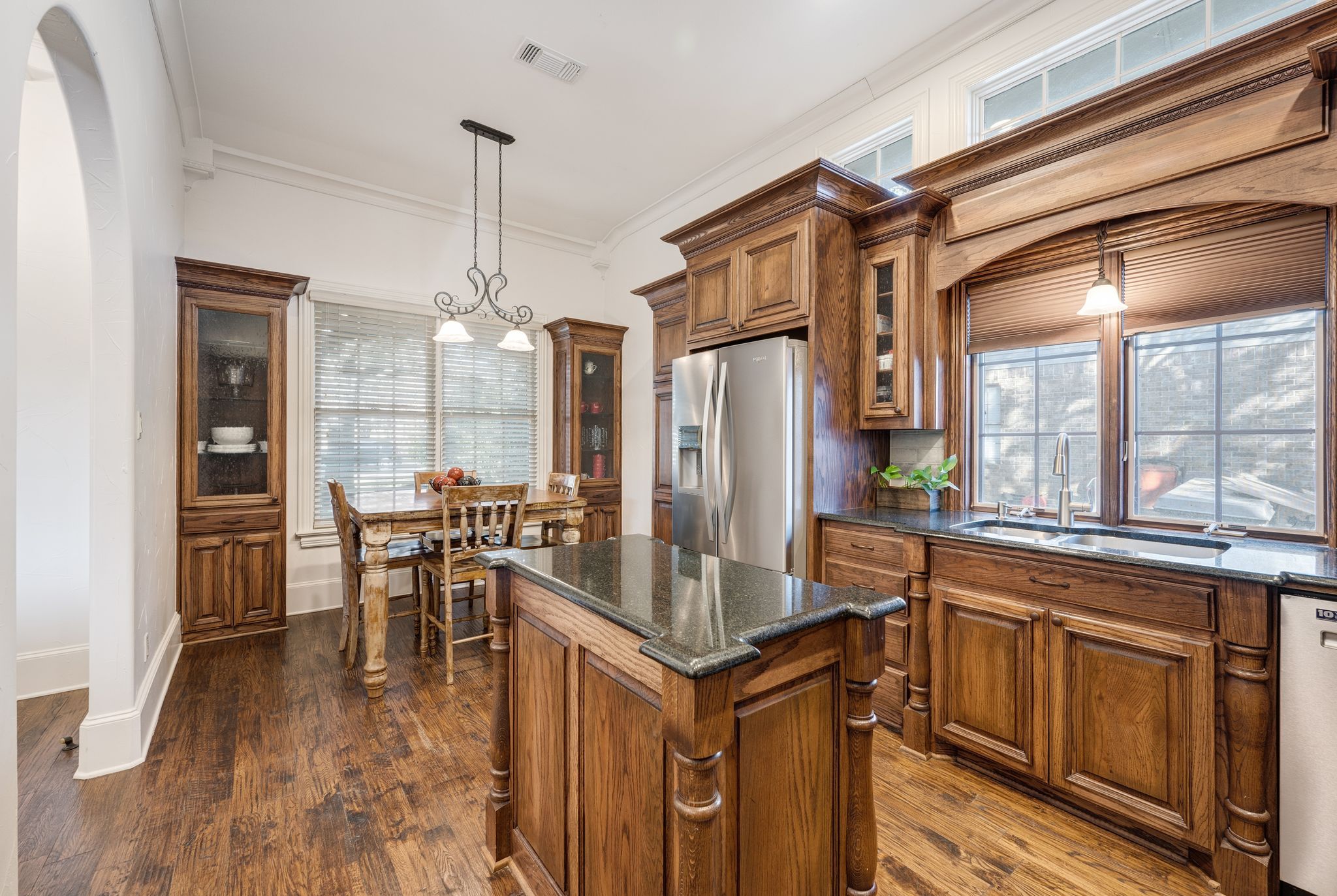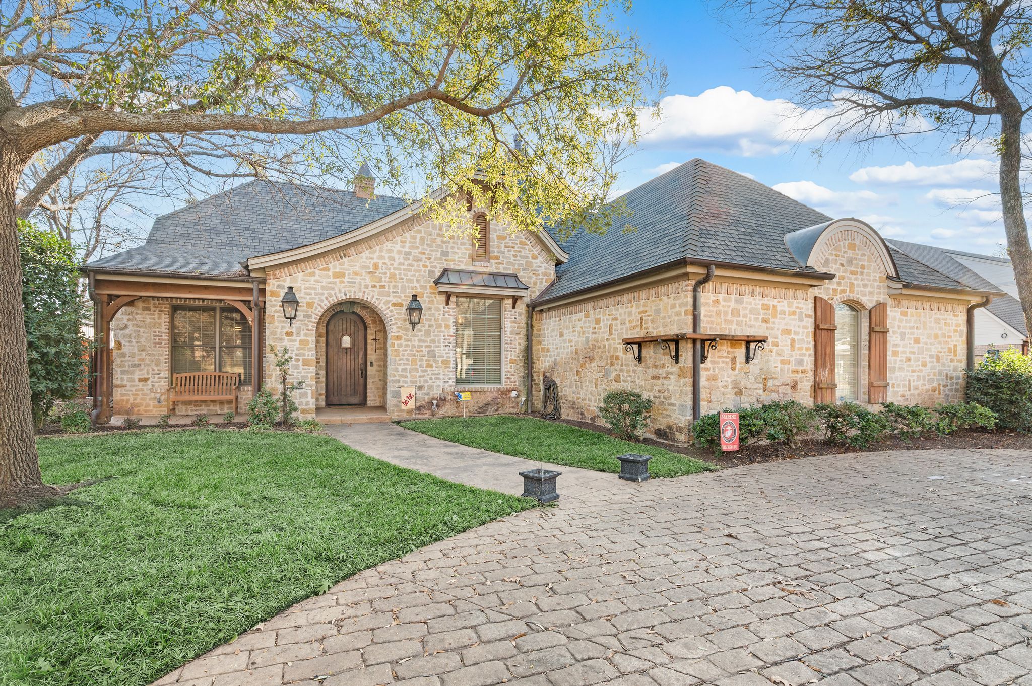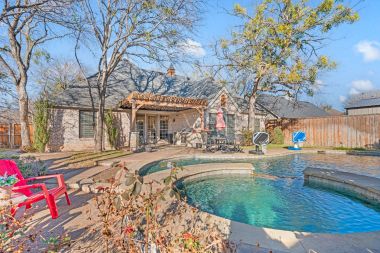 OLD WORLD TUDOR STYLE HOME WITH CLASS GALORE. This immaculate, completely custom, one-of-a-kind residence was built by a true master craftsman, with no detail overlooked. rom the moment you arrive, a stamped concrete circular drive, stunning landscaping, and cozy gas-burning lanterns create an unforgettable first impression. Architectural details elevate the exterior, including copper standing-seam metal accents, custom wood garage doors, and custom half-pipe copper gutters with copper round downspouts. The roof features BP Manoir Lifetime Class 3 shingles, offering both timeless beauty and long-term durability. Inside, soaring ceilings enhance the sense of grandeur, complemented by hand-scraped hardwood and tile flooring, deluxe custom trim, and beautifully crafted cabinetry throughout. Granite countertops are featured in every space, while the kitchen shines with stone backsplash, stainless steel appliances, and custom finishes designed for both function and style. The living area is anchored by a stunning rock fireplace with a distressed custom mantle and framed by expansive windows that overlook the backyard oasis. Just outside, an inviting outdoor living center opens to a resort-style saltwater pool and hot tub, creating a private retreat ideal for entertaining or relaxing. Adding to the home’s versatility is a separate structure complete with air conditioning and a bar—perfect for a pool house, guest space, hobby room, or private retreat. This exceptional property blends timeless Old World character with modern comforts and resort-style living in a peaceful Bridgeport setting. Truly unique and meticulously crafted, 2208 Fair Oaks is a rare offering that must be experienced in person.