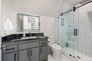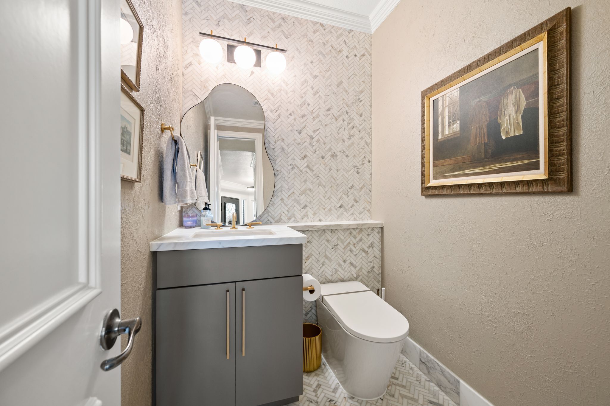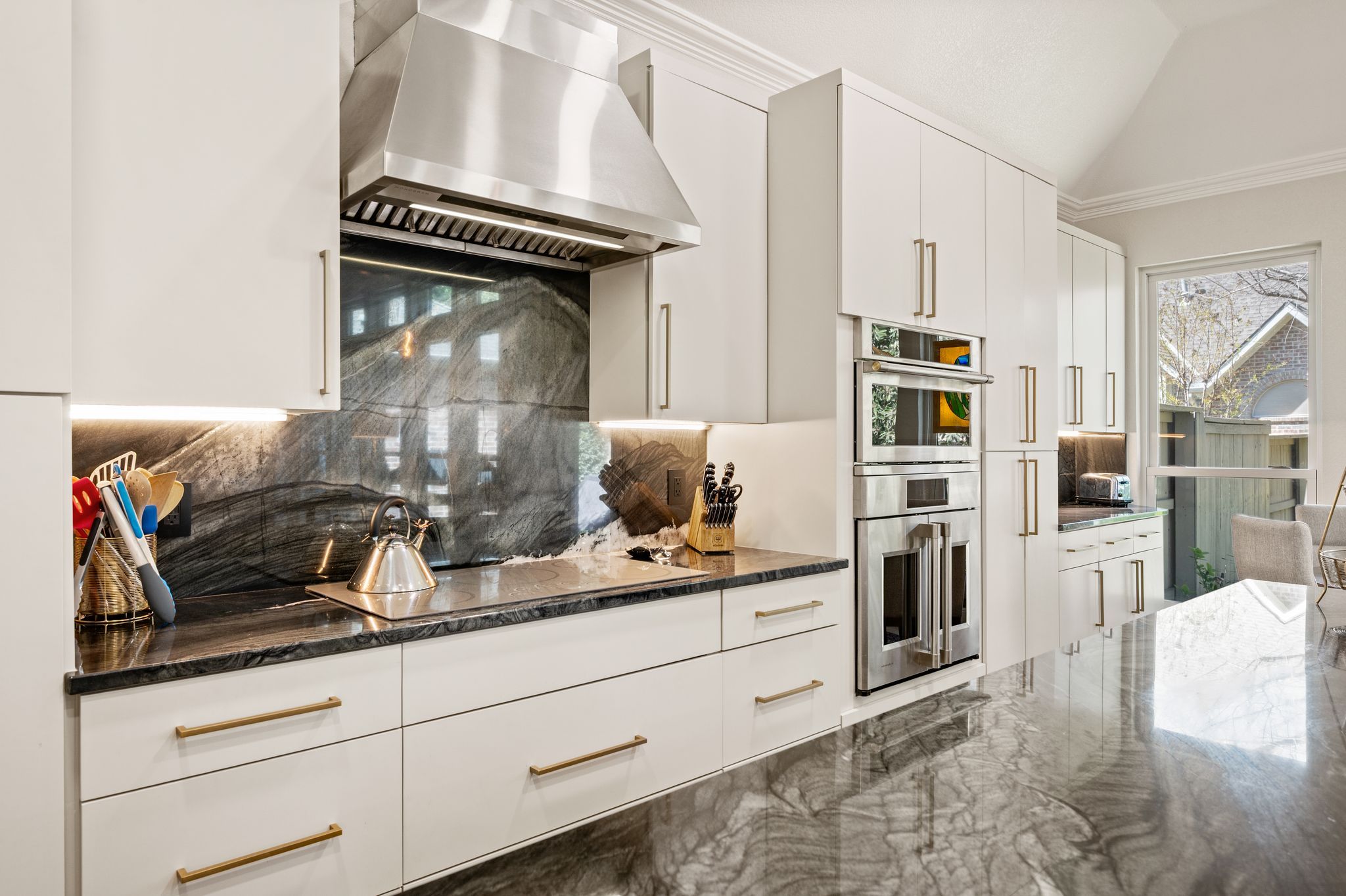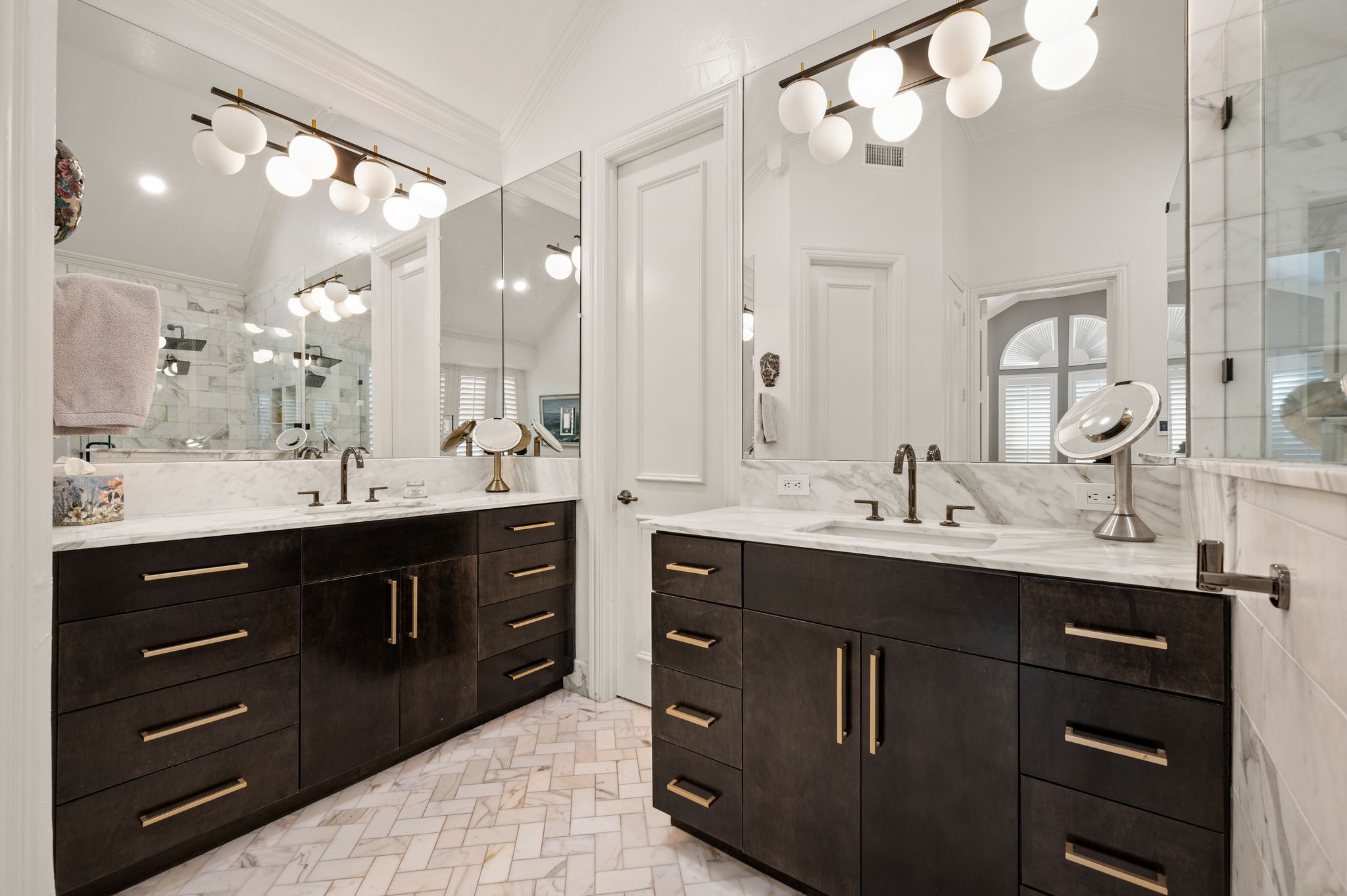 The primary suite is located on the main level and features a fully remodeled spa-inspired bath, complete with finishes in Italian marble, frameless glass shower, and a custom-designed closet system. A downstairs power bath is also finished in Italian marble. Secondary baths have been renovated with custom cabinetry featuring soft close doors and drawers, frameless shower enclosures, quartz counters and elegant fixtures.