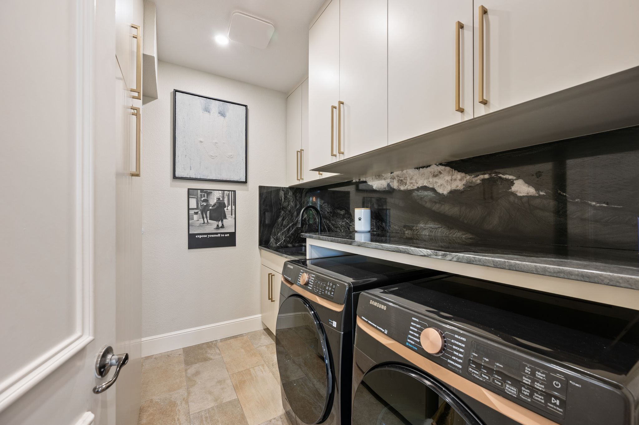 The utility room is equally well-appointed with granite countertops, a deep sink, and floor-to-ceiling storage.