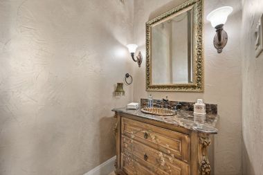 The first floor primary suite offers a luxurious private retreat, while a first floor guest bedroom provides flexibility for guests or multi-generational living. Additional functional spaces include a laundry room with sink and extra storage. Upstairs features a large game room with a Juliet balcony overlooking the den, plus a snack bar with beverage refrigerator and microwave, and a full media room with a dedicated media closet, creating the ultimate entertainment space.