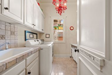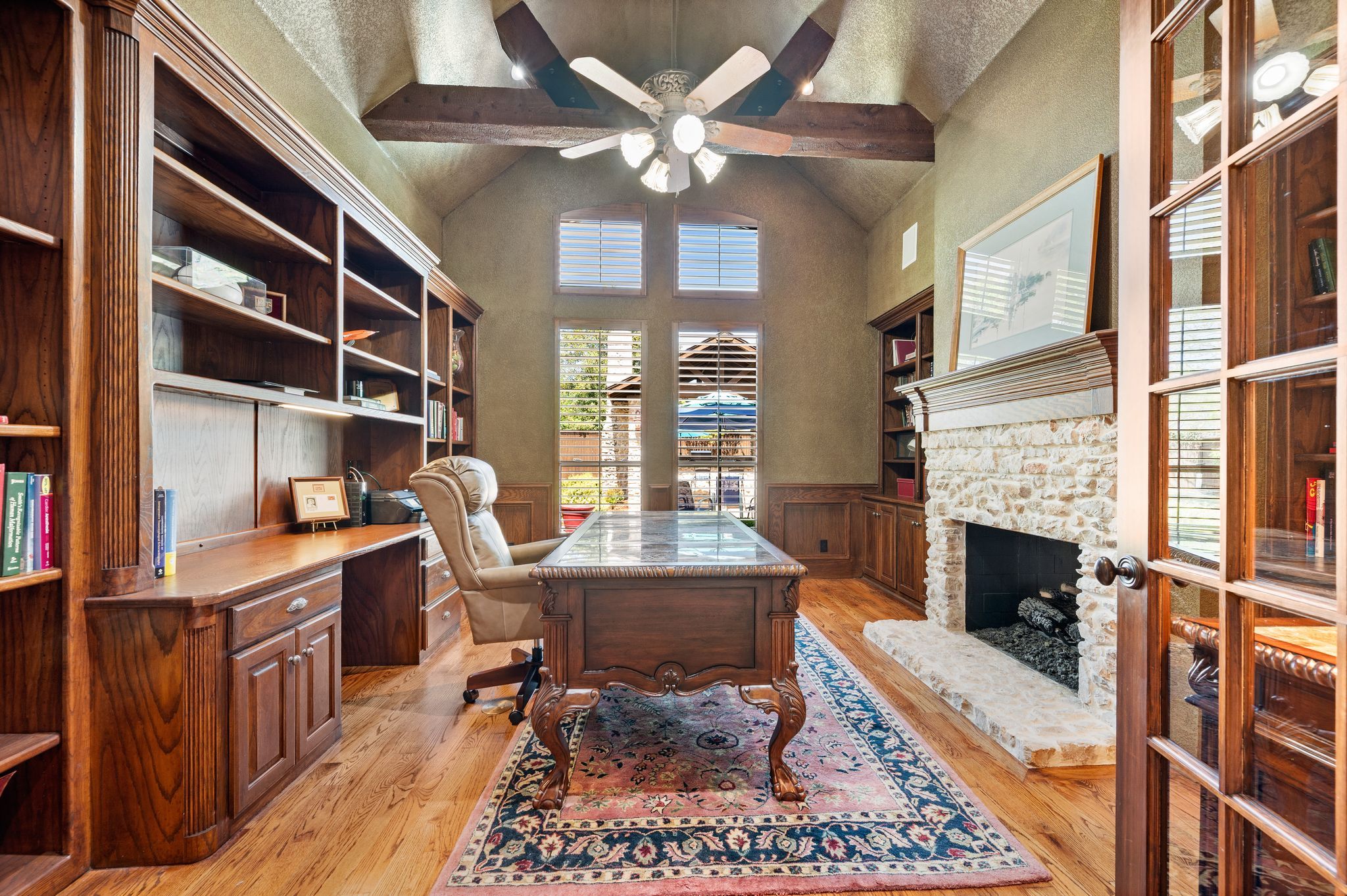 The island kitchen is designed for both everyday living and entertaining and includes a commercial grade gas range, pot filler, built-in refrigerator, granite countertops, large island, and a butler’s pantry complete with an ice maker. The kitchen opens to the spacious living room where the focal point is a beautiful stone fireplace and tall ceilings with views of the backyard and outdoor living area. The breakfast area includes a built-in buffet cabinet providing additional storage and serving space.